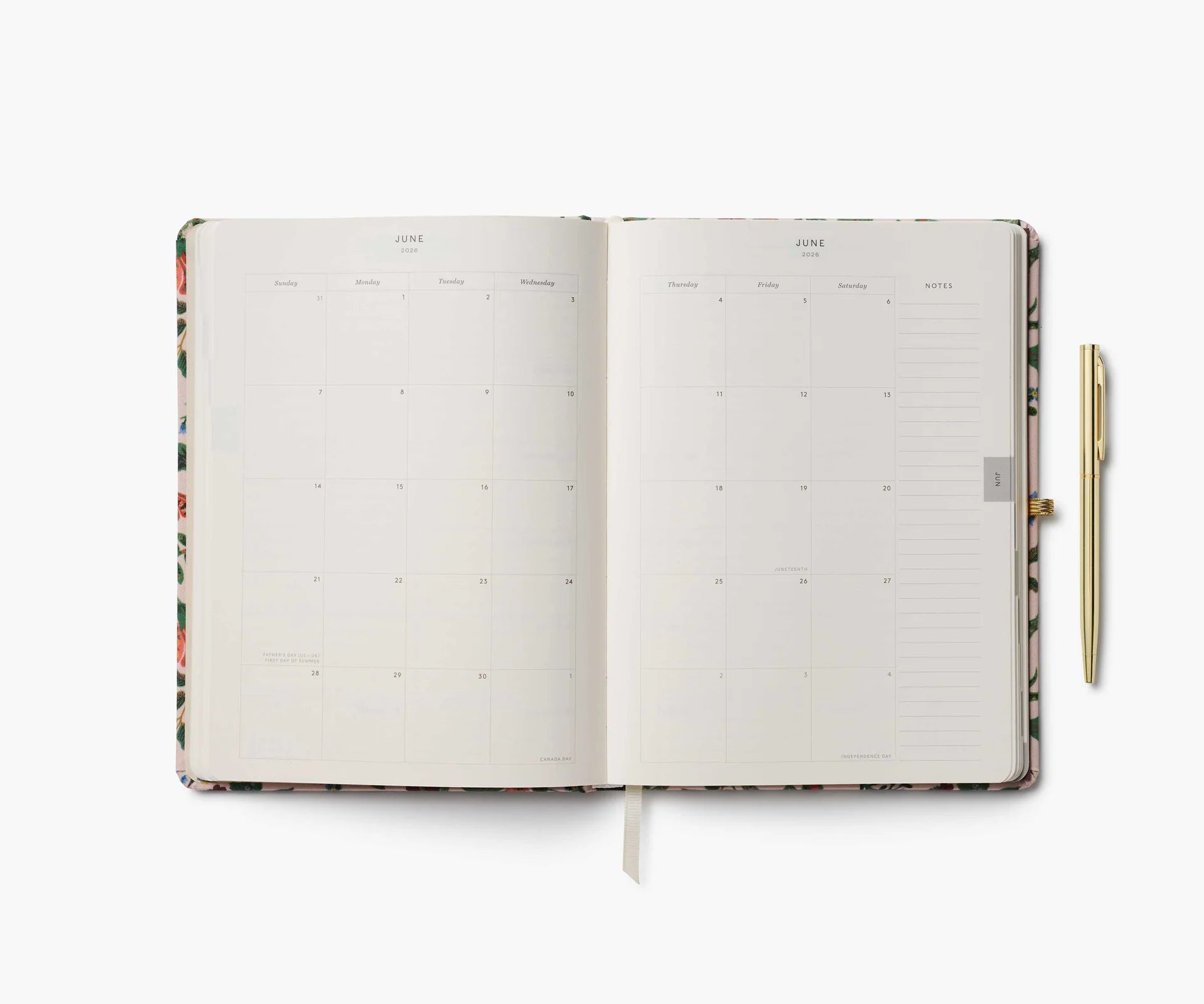 Spanning January 2026 to December 2026, this hardcover planner features printed Gracie florals, a foil-stamped year, and an elastic closure. In addition to weekly and monthly views, the interior includes space for weekly notes and to-dos, a list of celebrations, a pocket folder for storage, and a gold pen.