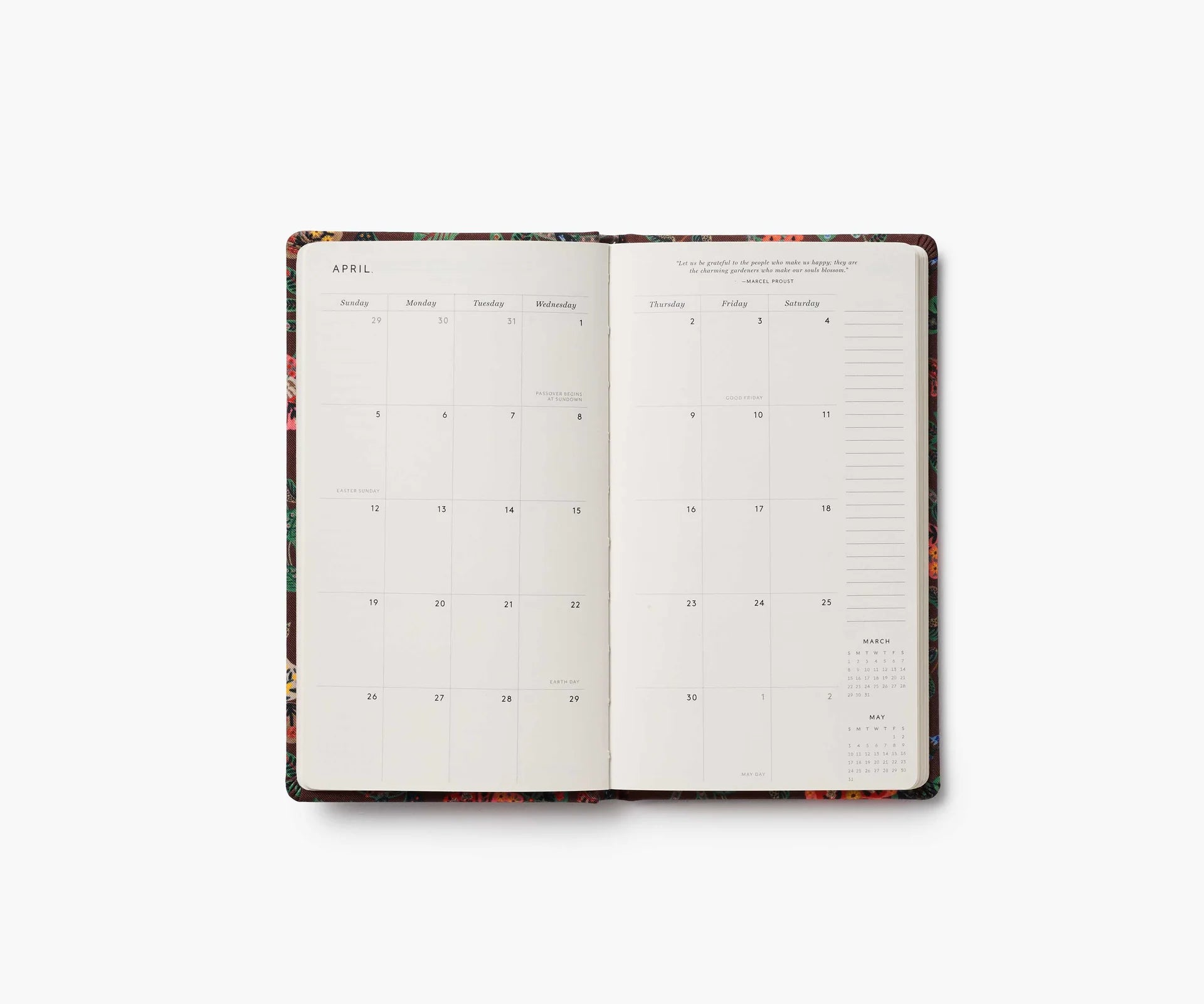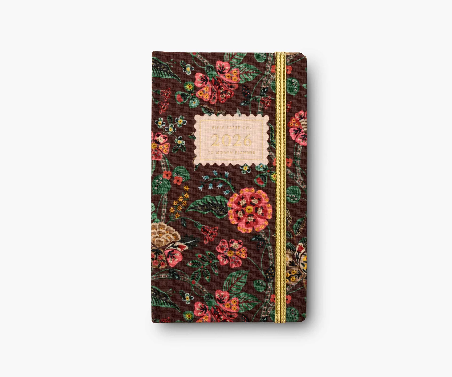 Great things come in small formats. The smallest planner in the lineup featuring a hard, fabric-wrapped cover, monthly and bi-weekly page views, sections for important dates and notes, and illustrated interior pockets.