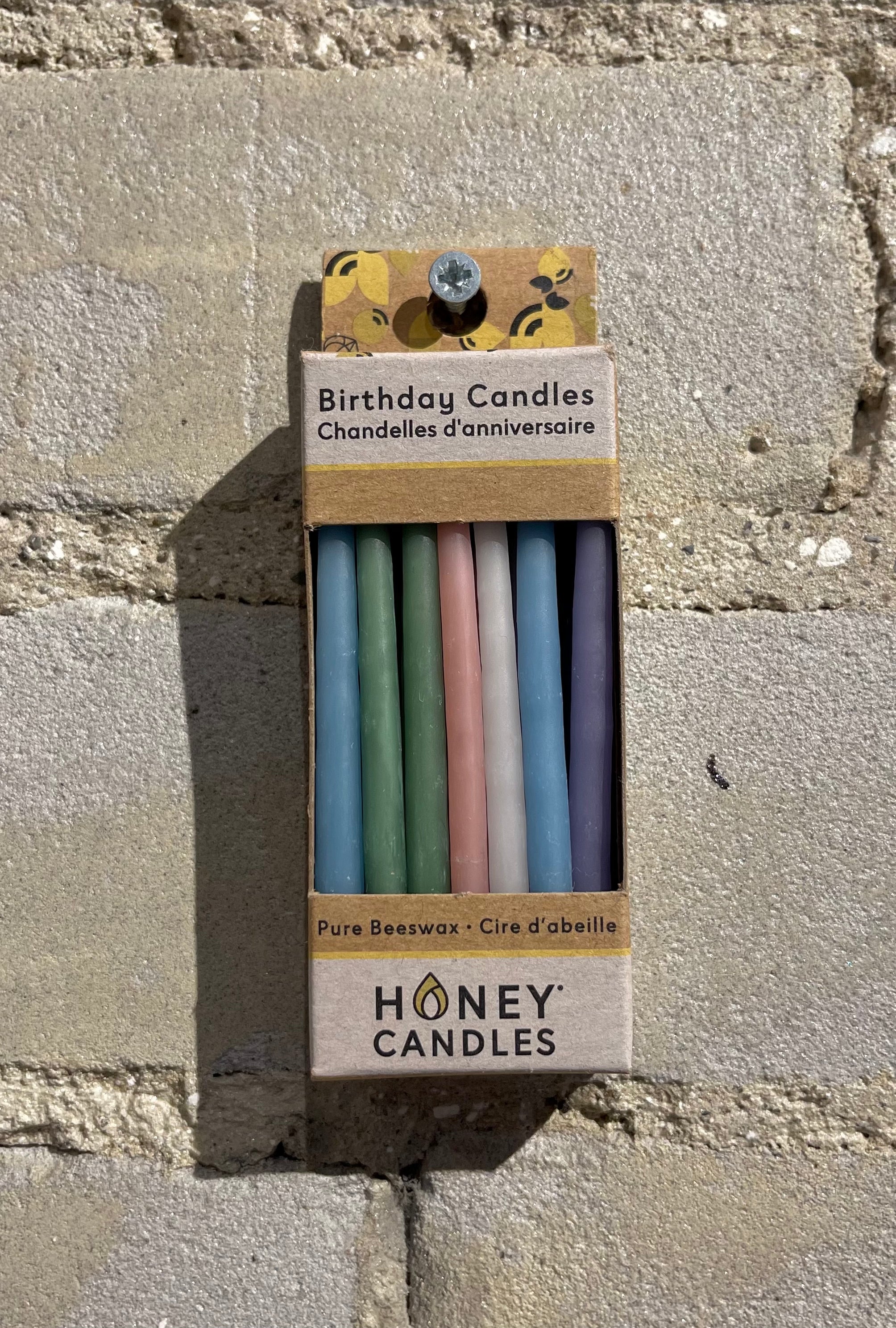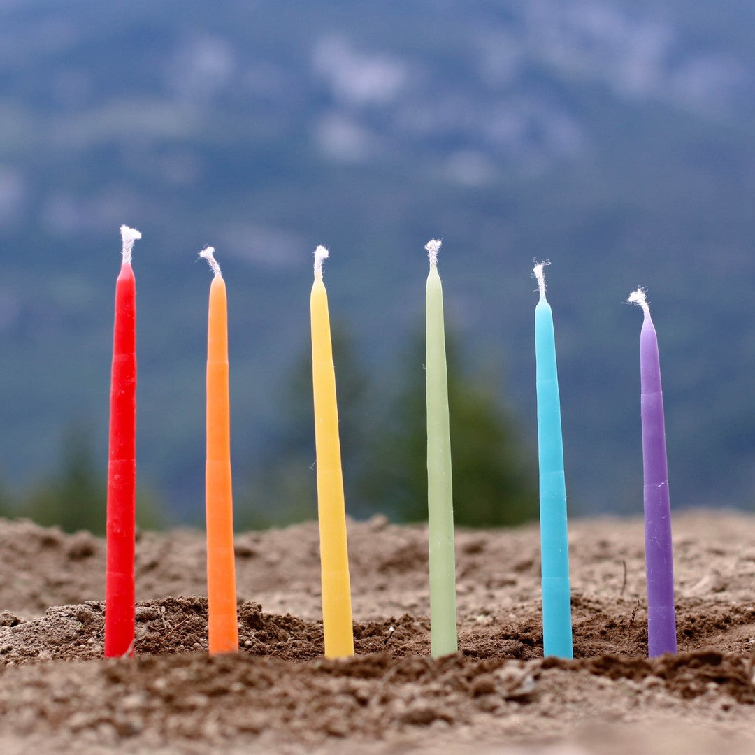 A pack of 20 pure beeswax birthday candles in a rainbow of Honey Candles® colors. Our new mixed pack includes 10 pastel birthday packs, and 10 royal birthday packs.