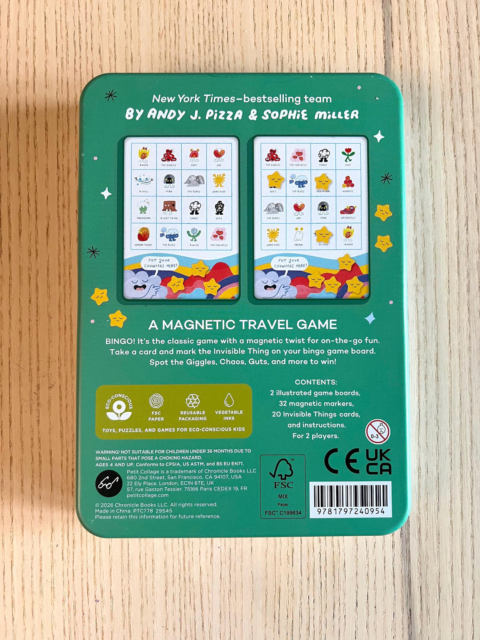 Includes: - 2 Illustrated game boards (each side of the tin)