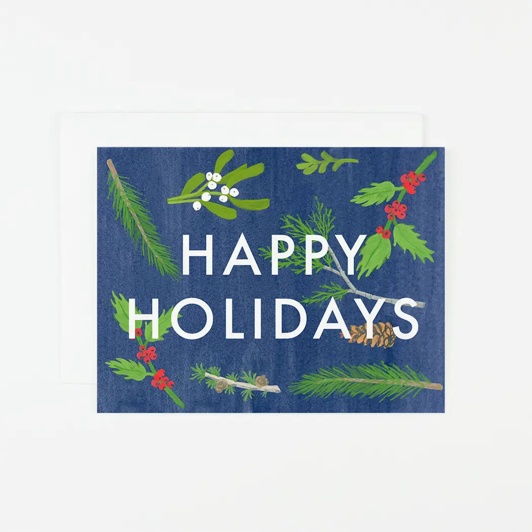 Hand painted holiday sprigs text reads "happy holidays" available in singles or a boxed set of 6