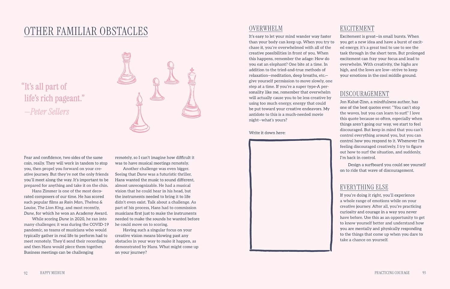 With step-by-step instructions, Happy Medium covers a variety of topics from the creative formula and how to amplify your intuition to overcoming fear and the benefits of using art as self-care. Packed with prompts to write, collage, draw, paint, and reflect, this illustrated guide is sure to improve your mood and will leave you feeling confident and excited about your creative potential.