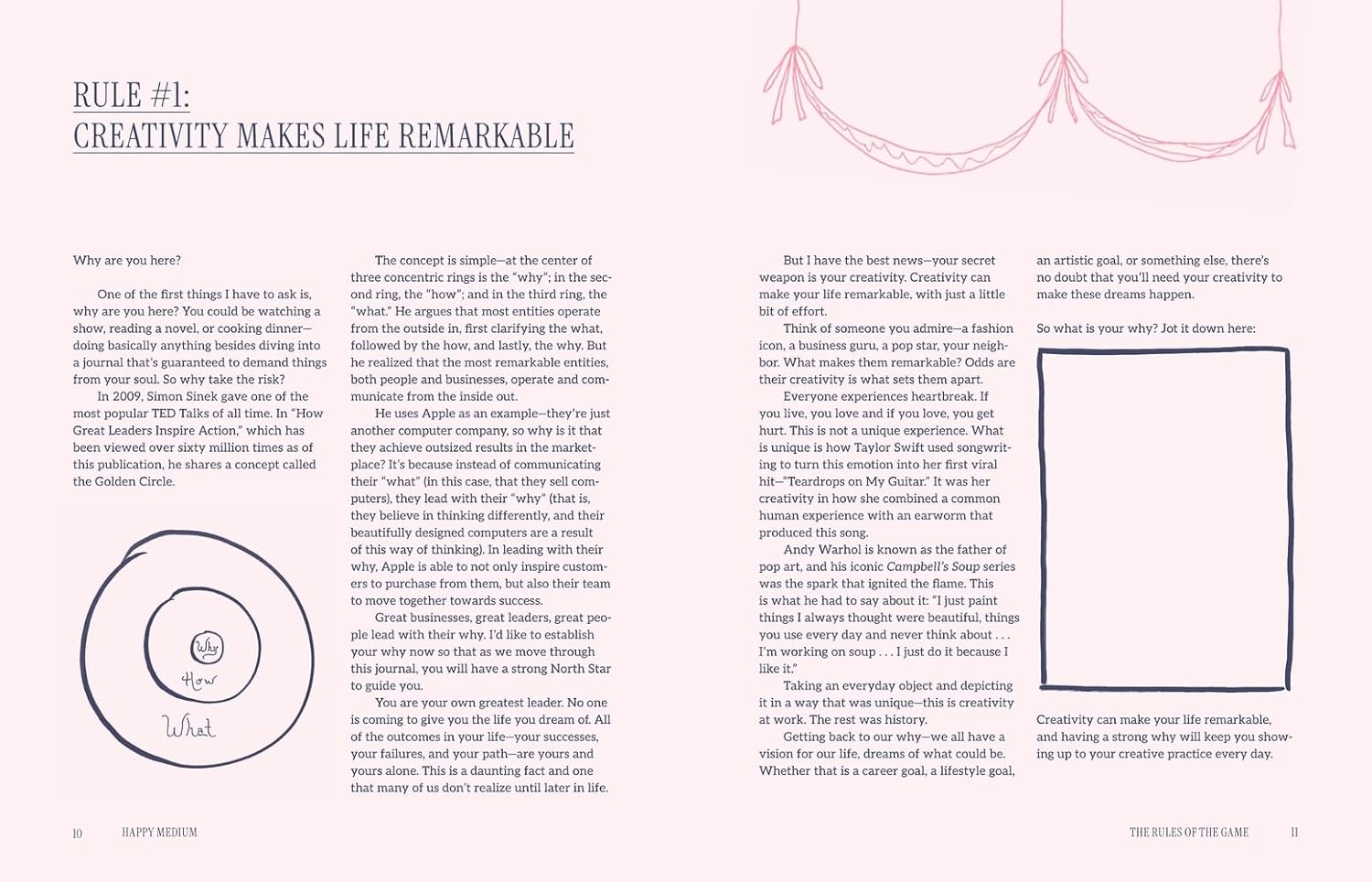 Happy Medium: A Guided Creativity Journal, is a battle-tested guided journal to understanding, practicing, and implementing creativity into our daily lives so that we can achieve outstanding results both professionally and personally.