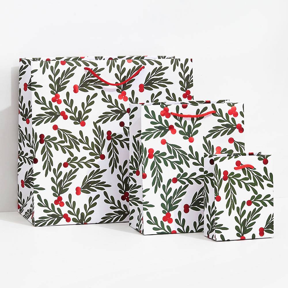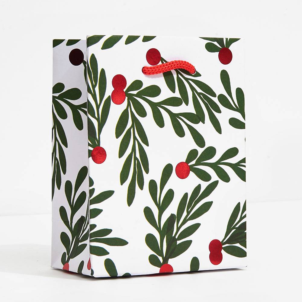 This gorgeous Paper Source design features a festive cedar branch greenery print along with gold foil accents. Strong and sturdy, our paper gift bags will hold up and are sure to be used again and again. This print is also available in wrapping paper!