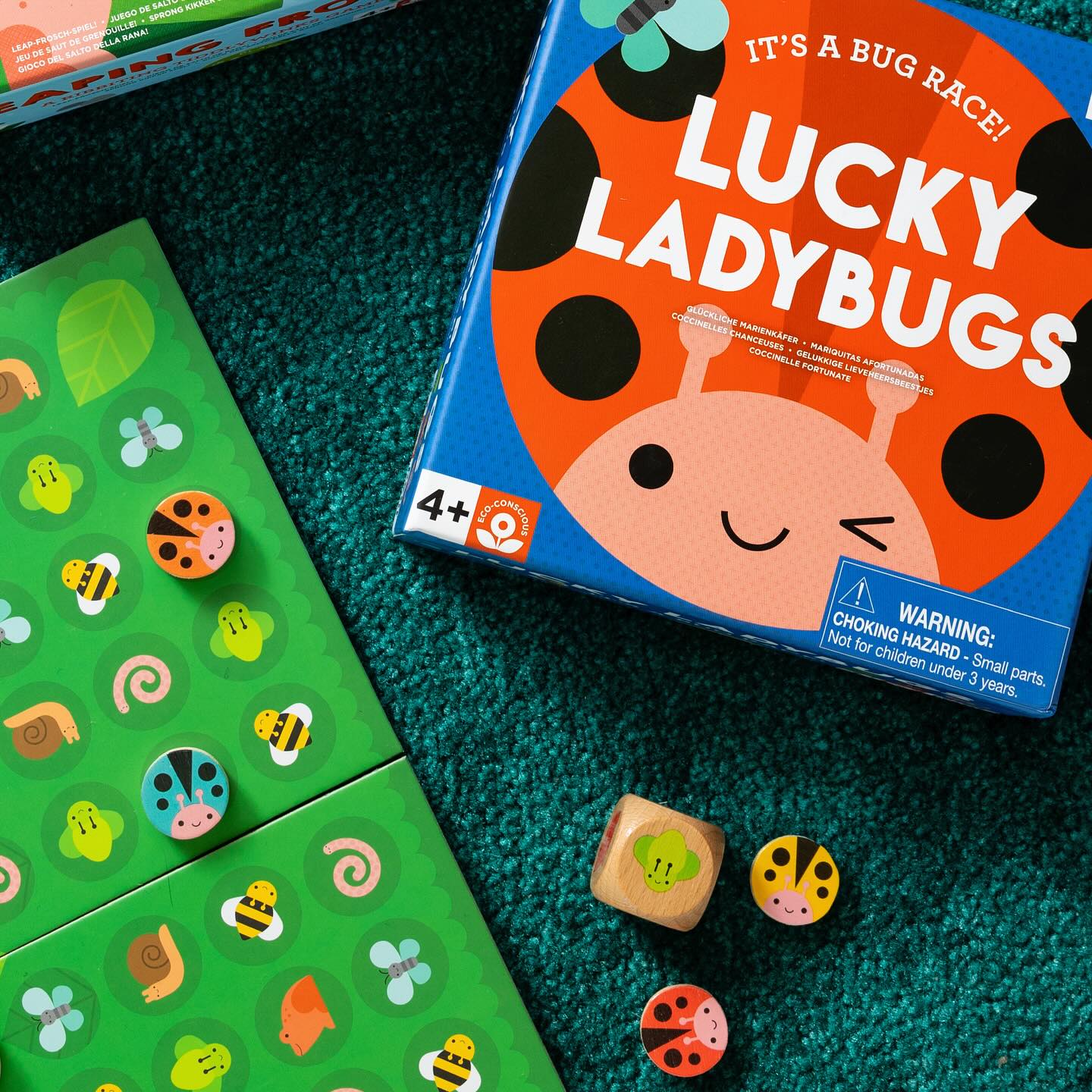 Roll the die to get your ladybug to the flower first, but watch out for the cheeky frog! Includes 4 wooden ladybugs, wooden flower, wooden die, and gameboard.