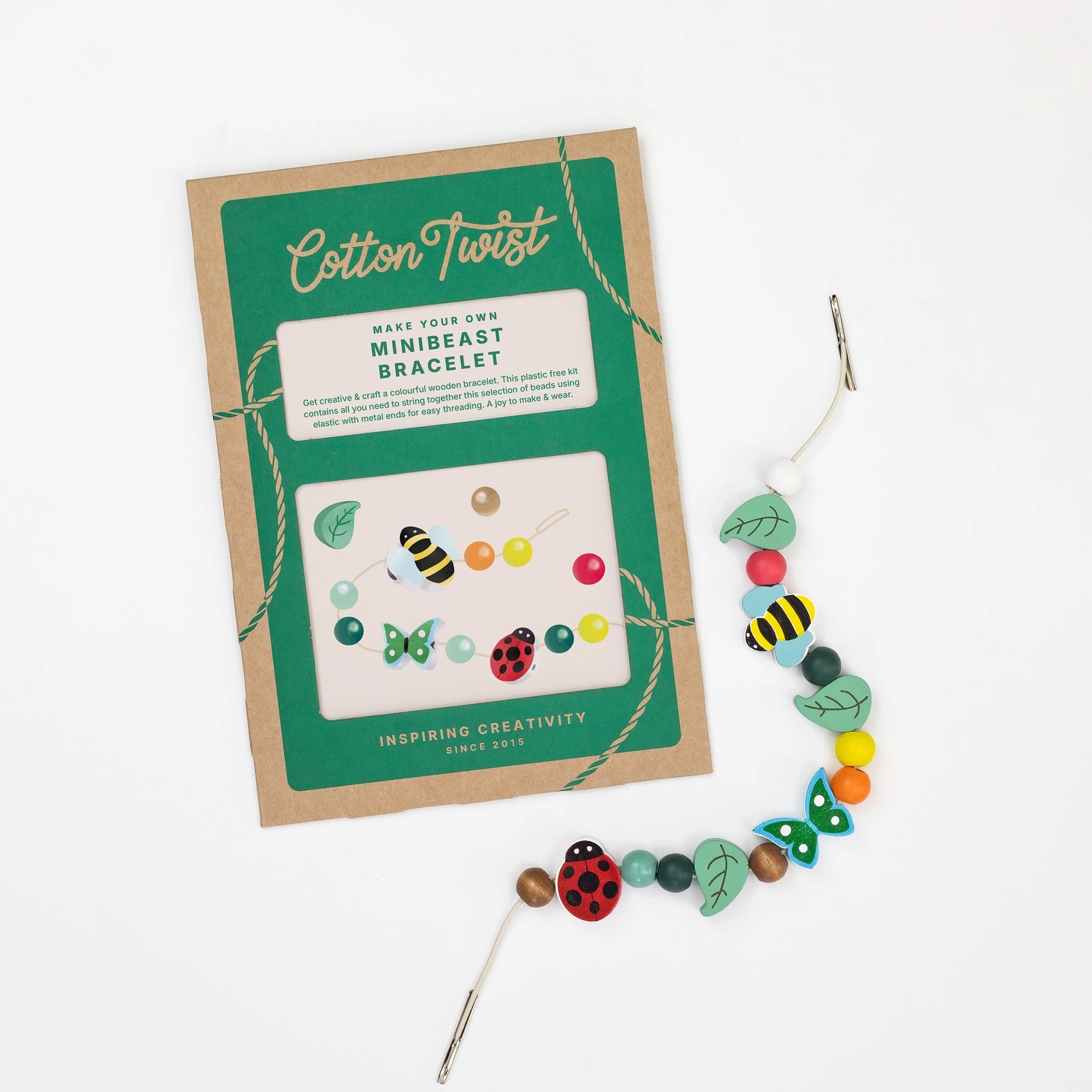 - Materials included: minibeast beads, leaf beads, spherical beads, elastic with metal ends