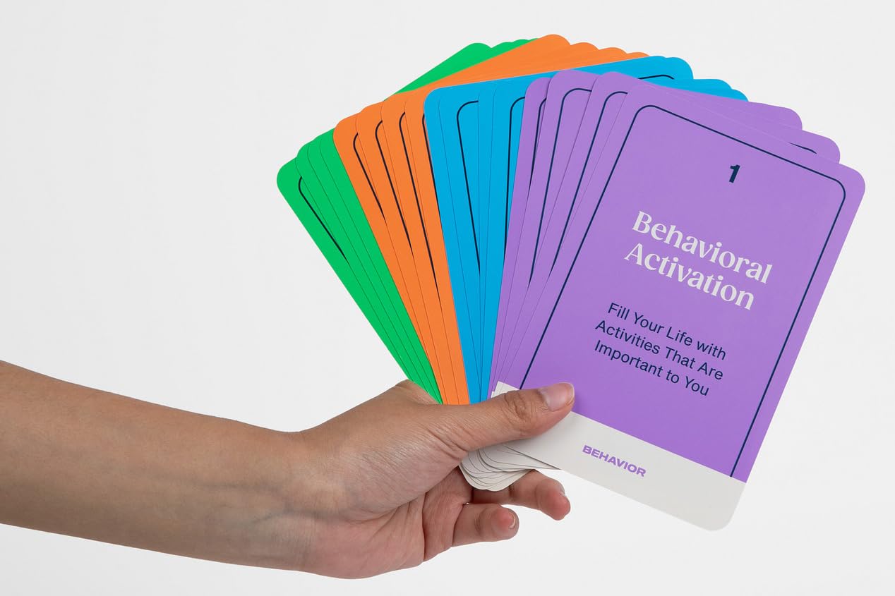 - 100 sturdy, color-coded cards with cognitive restructuring exercises, behavioral activation techniques, problem-solving skills, and coping strategies from CBT-D