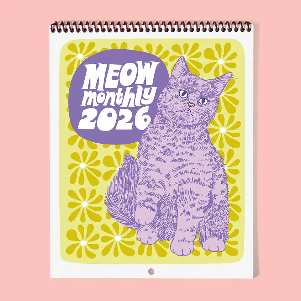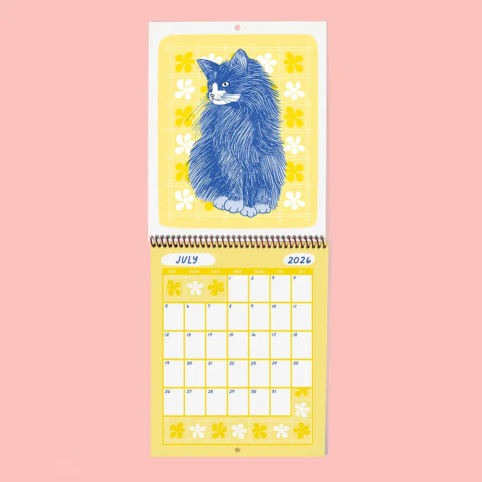 A colorful 12 month calendar showcasing various kitty friends! This calendar is 8 x 10 inches (8 x 20 hanging), flat printed, and coil bound with drilled hole for wall hanging.
