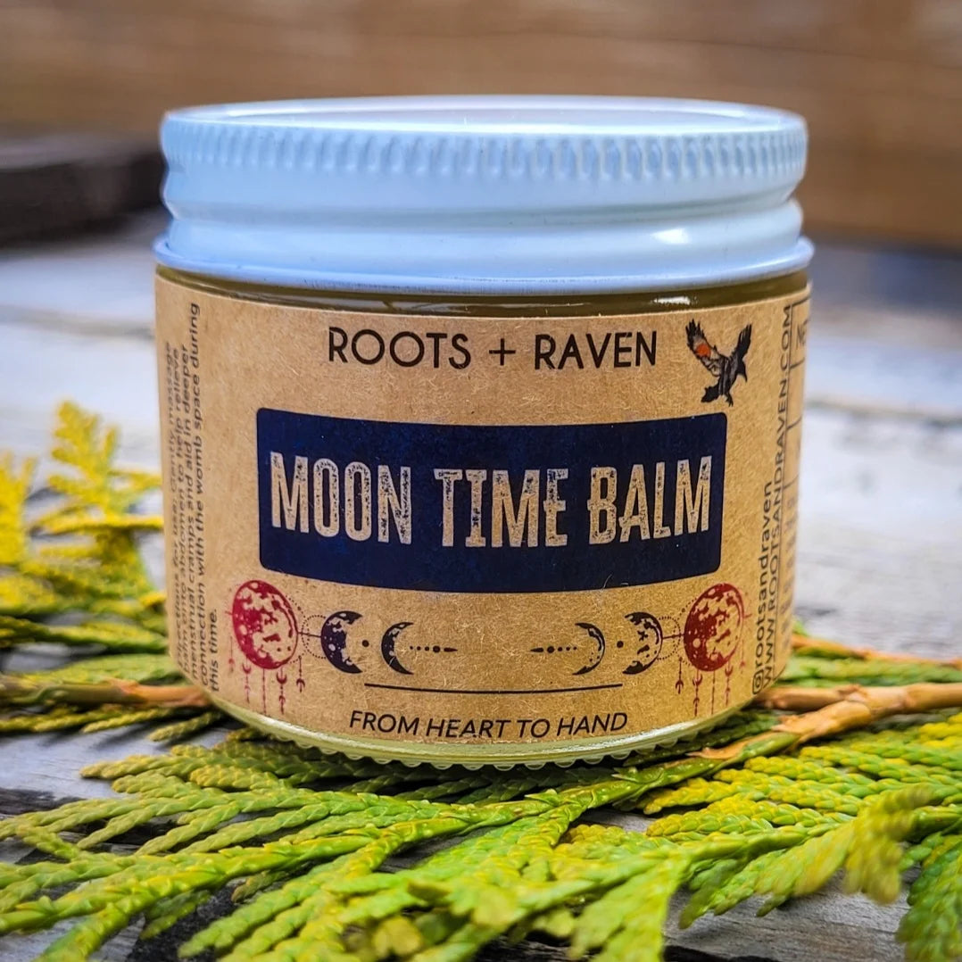 This is a topical support of medicines to ease discomfort during moontime and to support our connection to self and the womb space during this time.