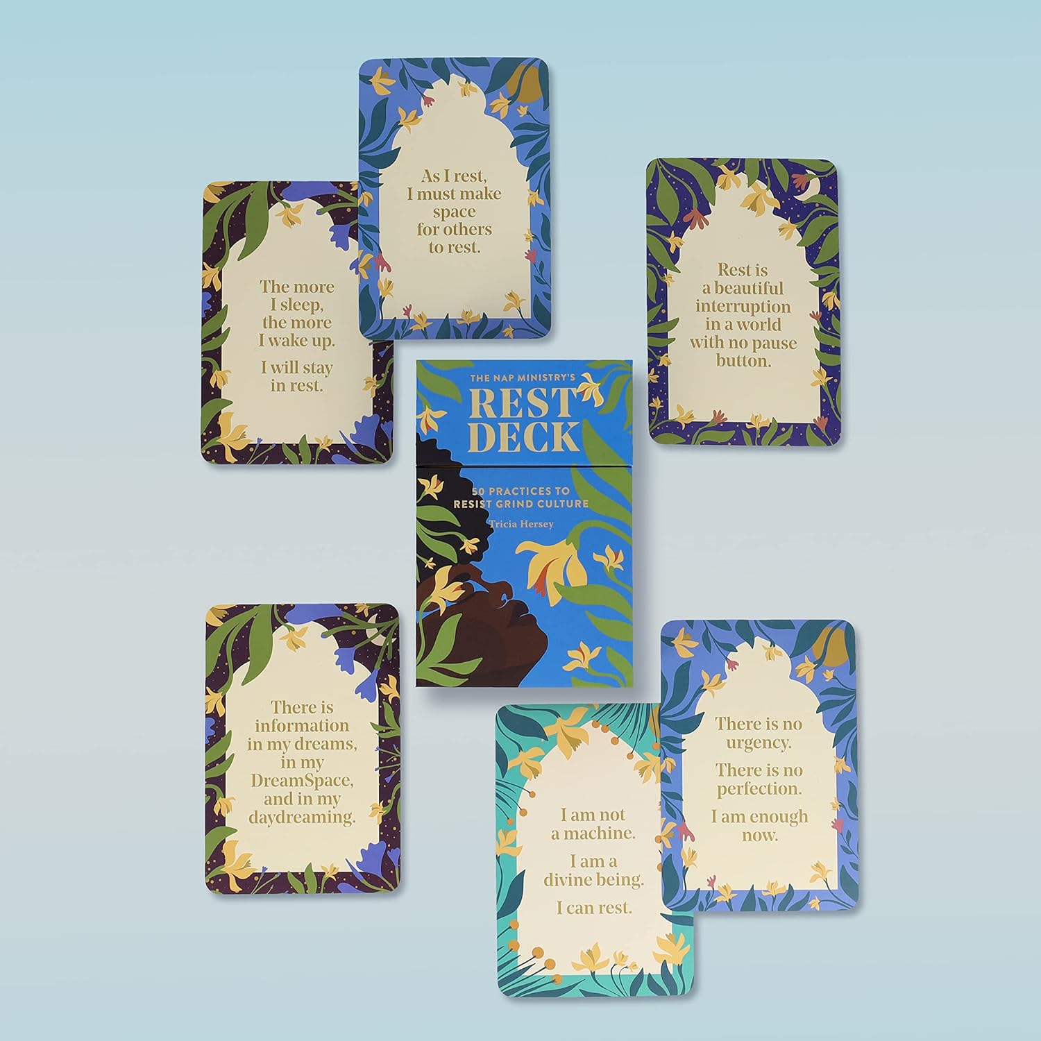 The Nap Ministry’s Rest Deck is a rousing call to reclaim rest in everyday life. Delivered in a stunning package with gorgeous artwork throughout, the deck combines restorative meditations with prescient wisdom from celebrated activist Tricia Hersey, a.k.a. the Nap Bishop, and founder of the Nap Ministry. Readers will discover 50 inspiring cards, each with an empowering affirmation and a simple practice to encourage rest, reju- venation, and imagination.