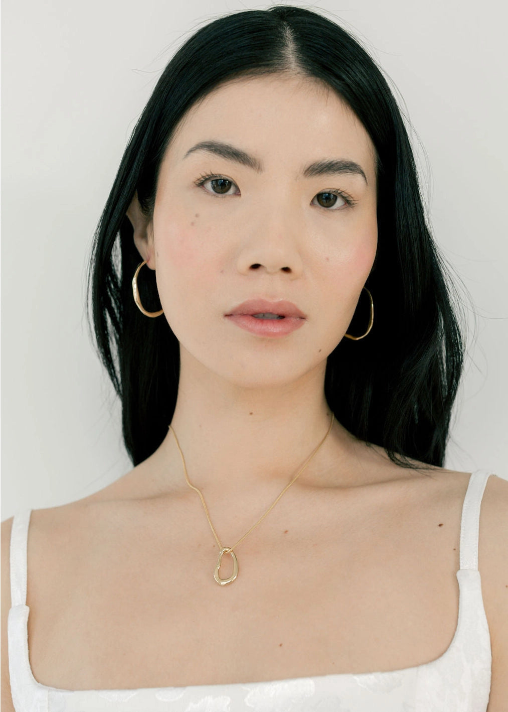The Renata Necklace features an organically shaped oblong pendant hung directly on a classic smooth snake chain.