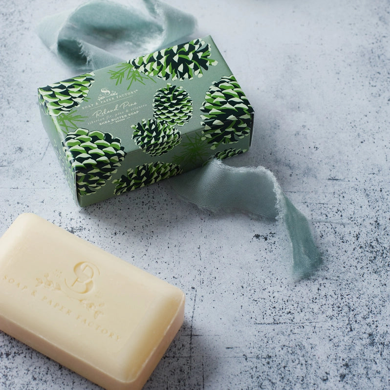 This Roland Pine soap bar is a seasonal favourite in the shop. Chic packaging and unique Roland Pine fragrance with notes of Siberian Fir, Cilantro and Citrus make this bar irresistible! Extra bubbly, skin softening and refreshing.
