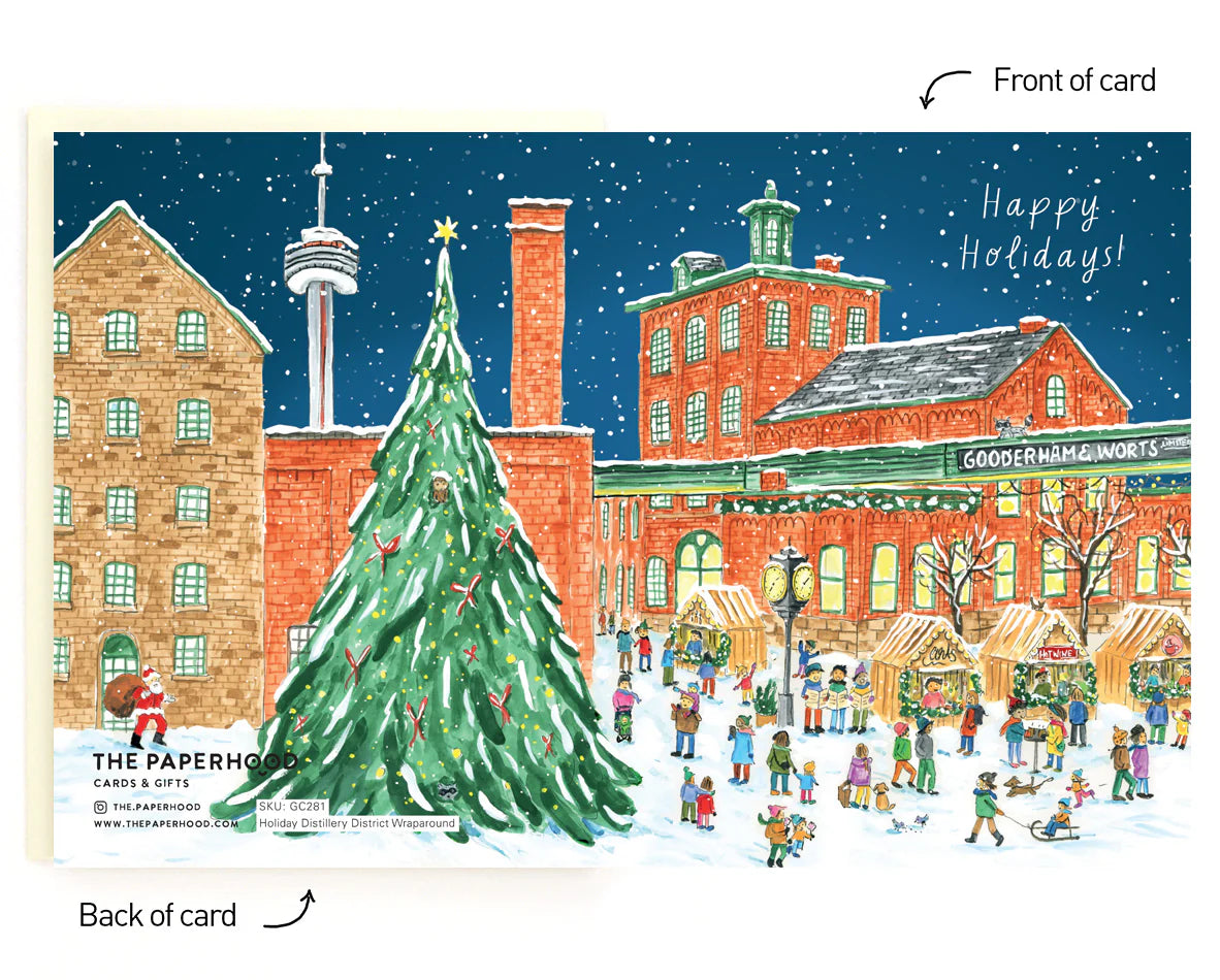 The art on these special wraparound holiday cards is continuous from front to back, featuring iconic Toronto landmarks and neighbourhoods: