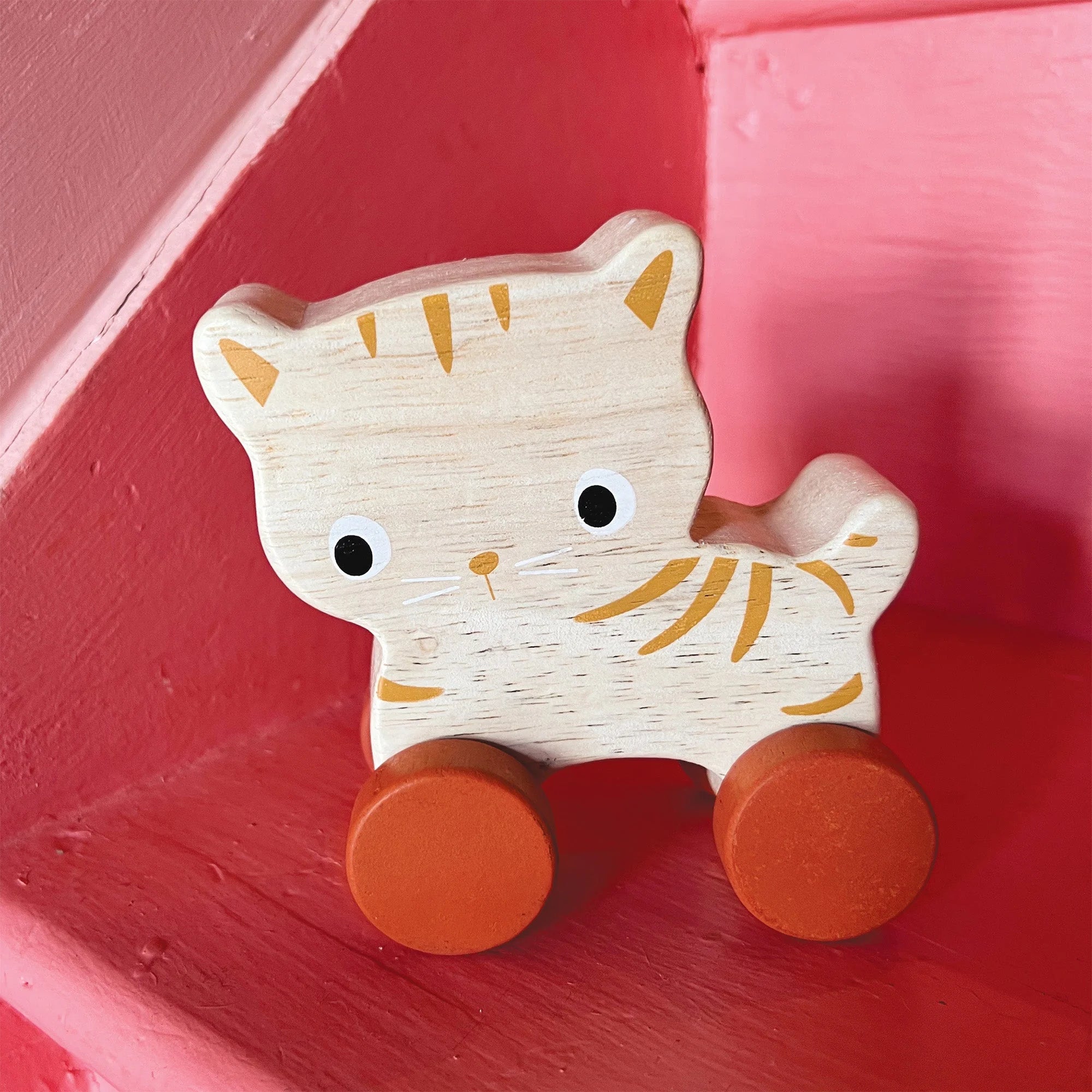 A sweet wooden handheld toy designed for babies and early toddlers. Features four wheels this sweet kitten encourages little ones to grasp, push, and explore movement through gentle, hands-on play.