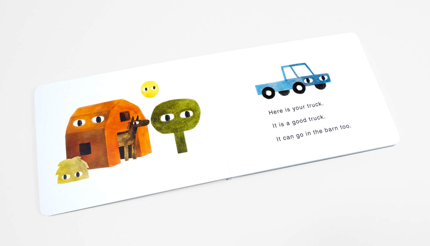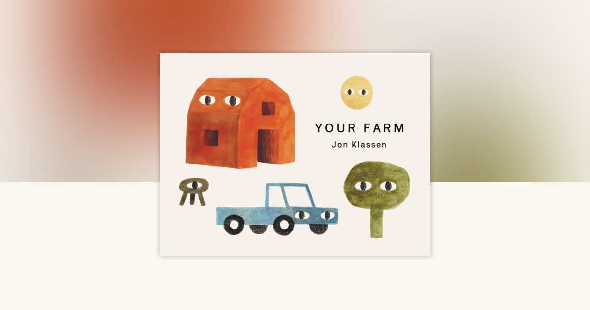 With a minimal tableau of familiar objects and a gentle rhythm suited for reading aloud, a farm and all its items—a horse and its hay, a truck, a stool, a fence—are assembled, ending with bedtime as the sun goes down. This is a farm for a young child to have whenever they want to go there. One in a trio of board books focusing on safe spaces, comfort, and imagination, Your Farm signals both a departure for Jon Klassen and a story whose peculiar touches of whimsy stamp the book as iconically his.