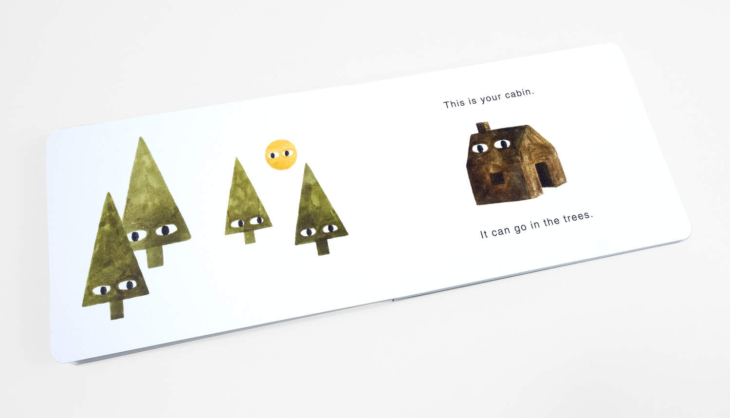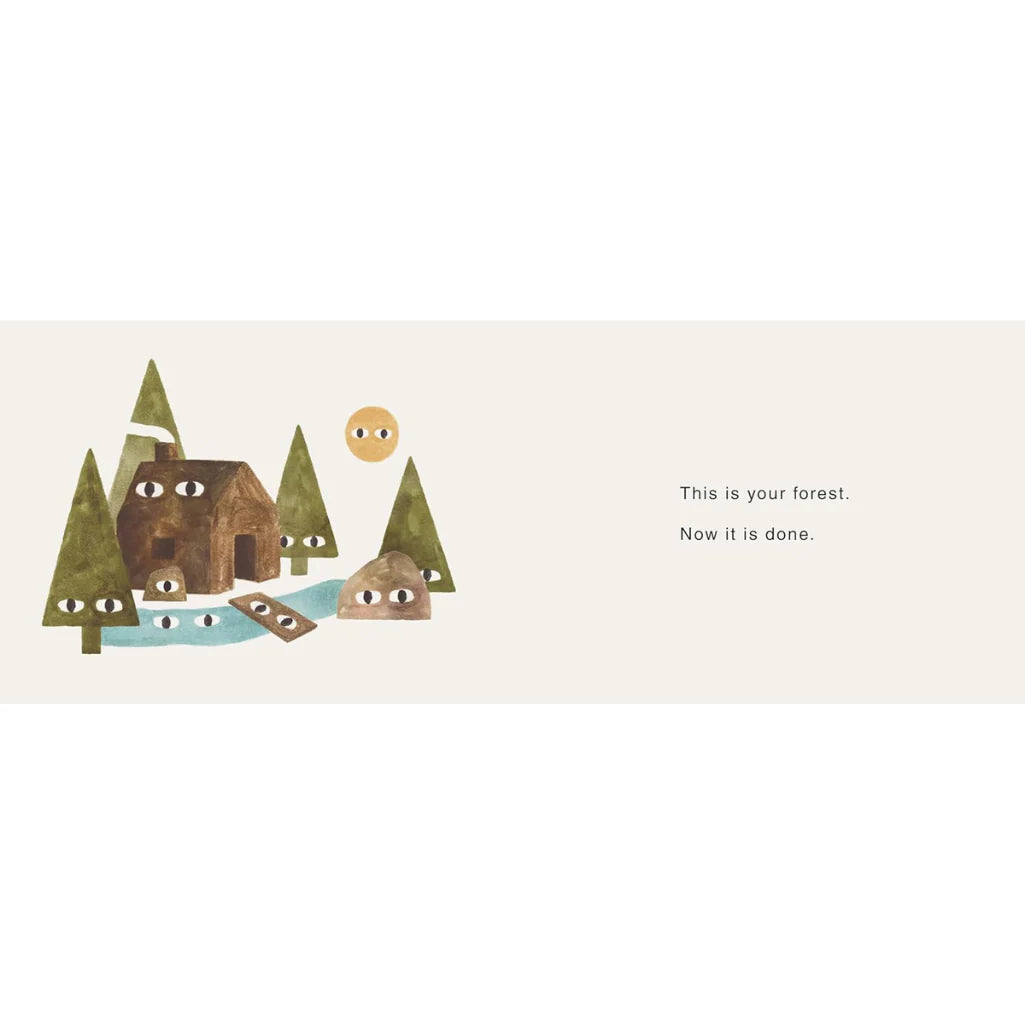 With a minimal tableau of familiar objects and a gentle rhythm suited for reading aloud, a forest and all its items—a cabin, some rocks, a (nice) forest ghost, a stream, a bridge—are assembled, ending with bedtime as the sun goes down. This is a forest for a young child to have whenever they want to go there. One of a trio of board books focusing on safe spaces, comfort, and imagination, Your Forest signals both a departure for Jon Klassen and a story whose peculiar touches of whimsy stamp the book as iconically his.